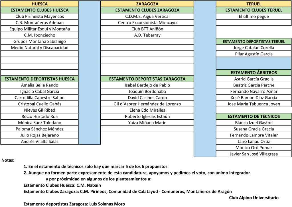 DADA LA PREMURA con que se ha desarrollado todo el proceso electoral, ésta no es sino una relación de personas y clubes que han manifestado su intención de unir y no de separar, de coordinar y trabajar por lo que nos une, que no es sino “la montaña que nos merecemos”. No es en ningún caso exclusiva o cerrada y seguro que habrá muchas mas personas y clubes que asuman, si no todas, la mayor parte de las ideas que en este proyecto expresamos; y seguro que habrá también muchas otras idea o matices aquí no recogidos que podamos asumir e incorporar a nuestro trabajo del día a día. Esta candidatura no va contra nada ni contra nadie, sino a favor de la montaña que nuestros federados y federadas merecen. Esta candidatura quiere construir un espacio deportivo en positivo, integrador y dialogante, que es el que la montaña exige y merece.